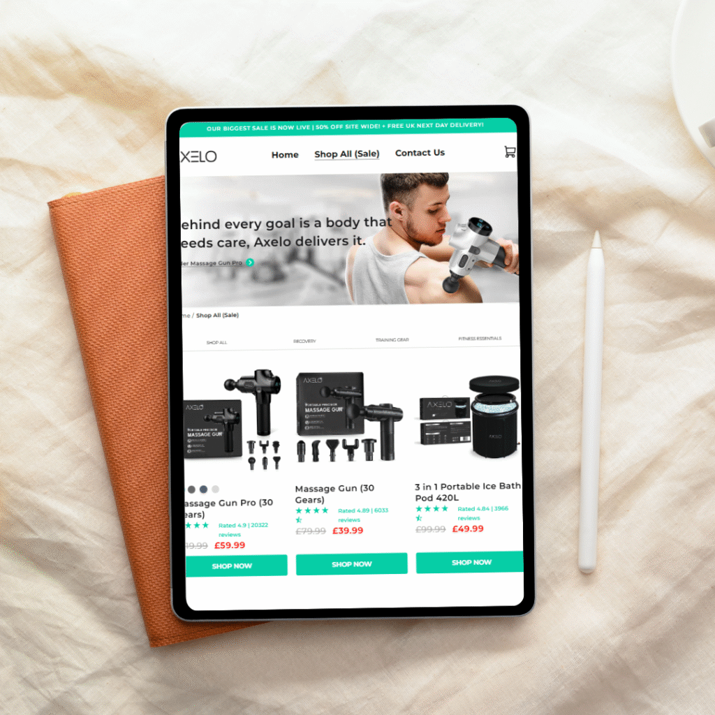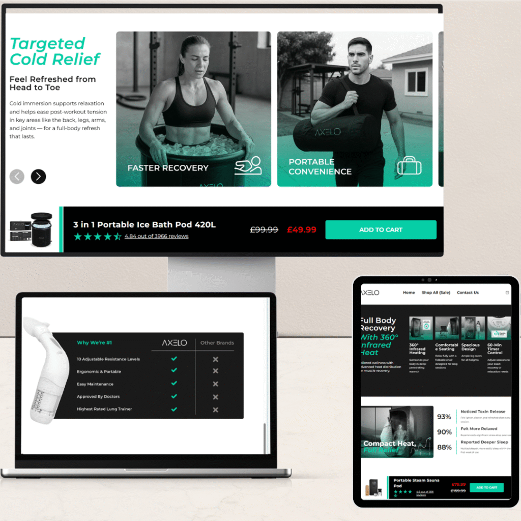 Axelo is a UK-based wellness brand offering premium recovery tools like massage guns, lung trainers, and sauna pods. I built their Shopify store to deliver an immersive, trust-infused shopping experience that reflects Axelo’s focus on performance, reliability, and recovery first.